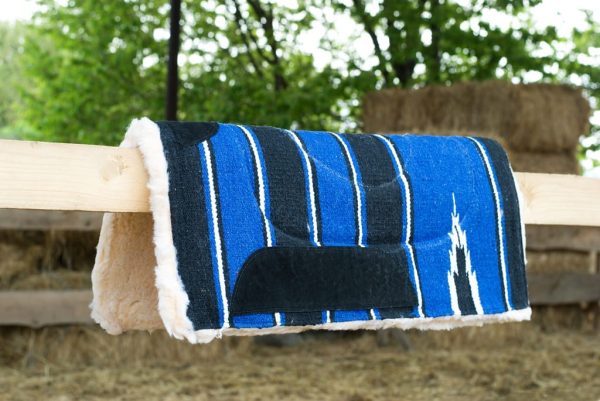 Westernová deka classic modrá. Rozmer podsedlovej deky je 75cm x 75cm (30 inch x 30 inch) a hrúbka 3cm (1 inch). Zo spodku podsedlovky našili hustý umelý baranček.